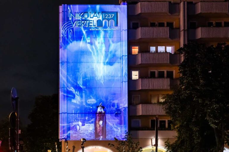A permanent landmark in every festival is Berlin’s oldest district, the Nikolaiviertel. It was rebuilt on the occasion of the 750th anniversary of the city and makes it a real Berlin sight. During the Festival of Lights it invites visitors to take a walk through the historic surroundings and past atmospherically illuminated squares and facades.