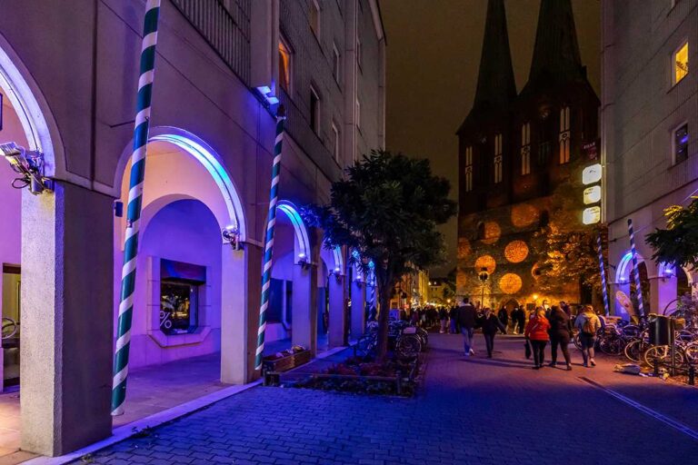 A place full of secrets. The dark alleys of an old magical city. In 2023, the Nikolai Quarter presented itself as a magical place with bright colors in the trees, angel wings and “Swings in the Clouds”.