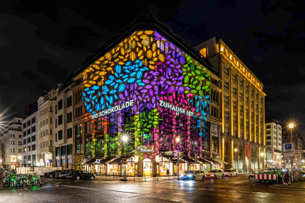 The façade of the Rausch Schokoladenhaus on Charlottenstraße also becomes a radiant highlight of the Festival of Lights: A captivating light installation bathes the historic building in glowing colors.